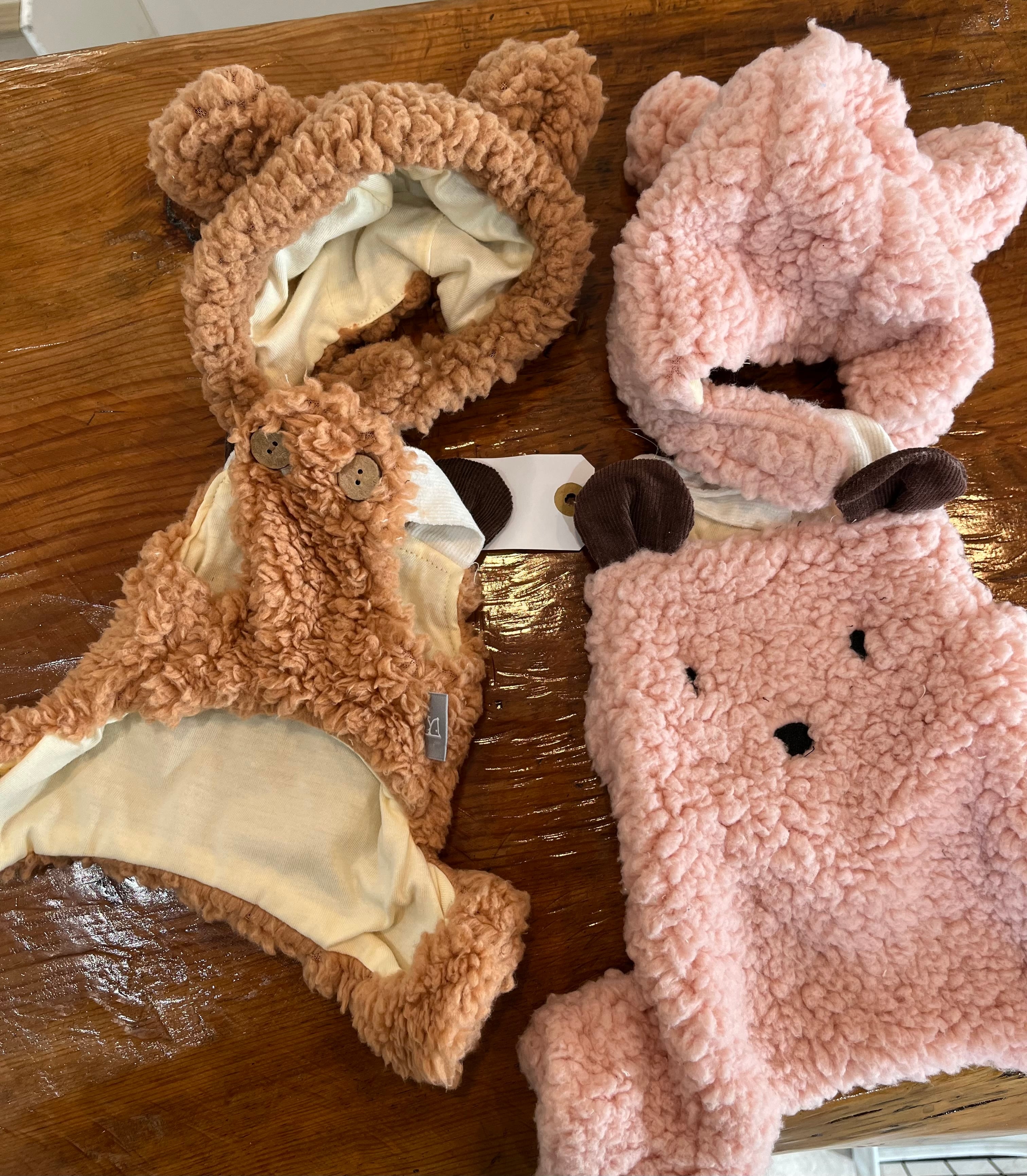 フードにお耳がついていて、とてもキュートです^^背中の部分にお顔がついていて、他と被りにくい、もこもこなお洋服です⭐︎